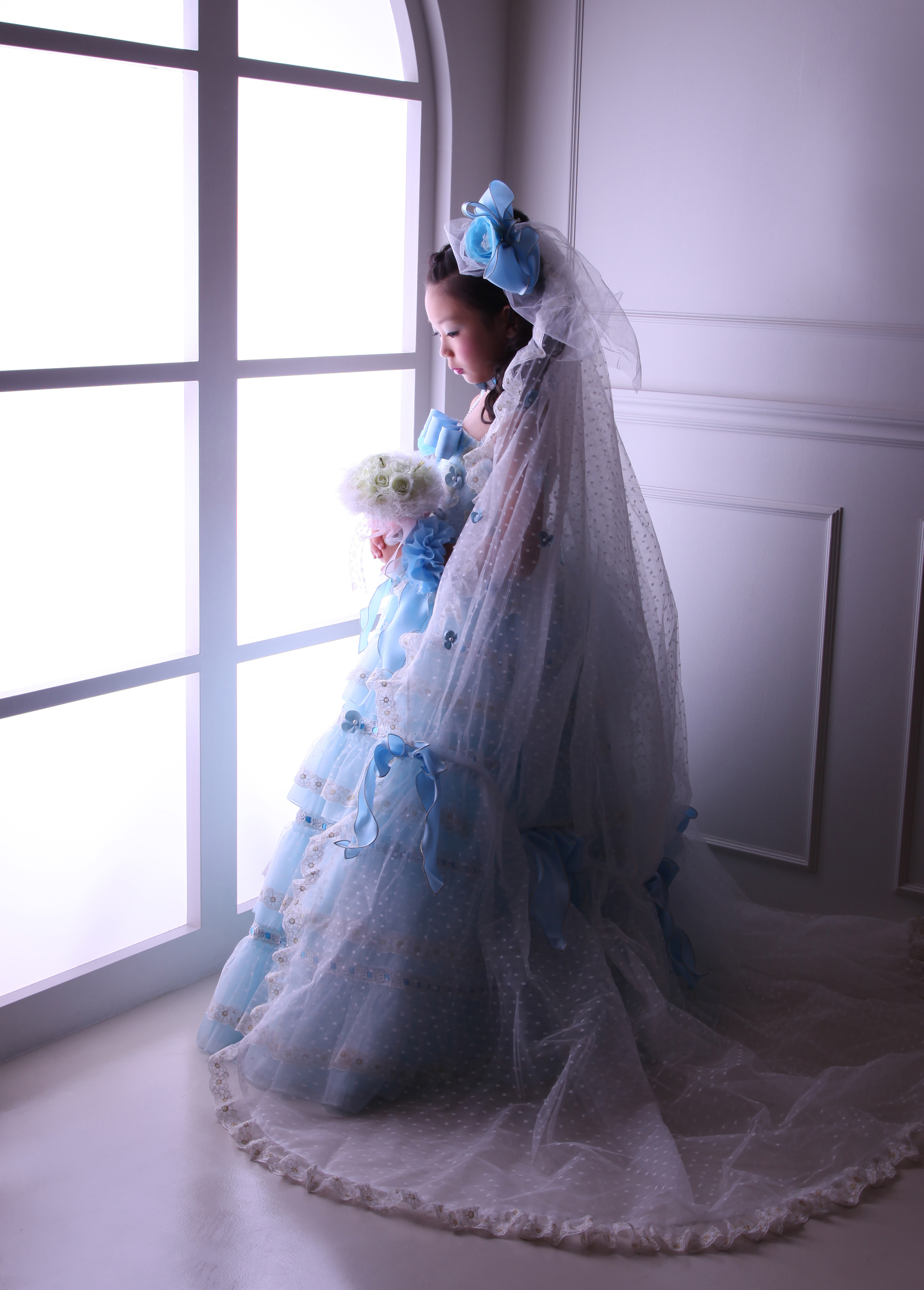 8歳になった今年はとても大人っぽい表情をみせてくれたので、窓の前でしっとりドレス姿で撮影しました。