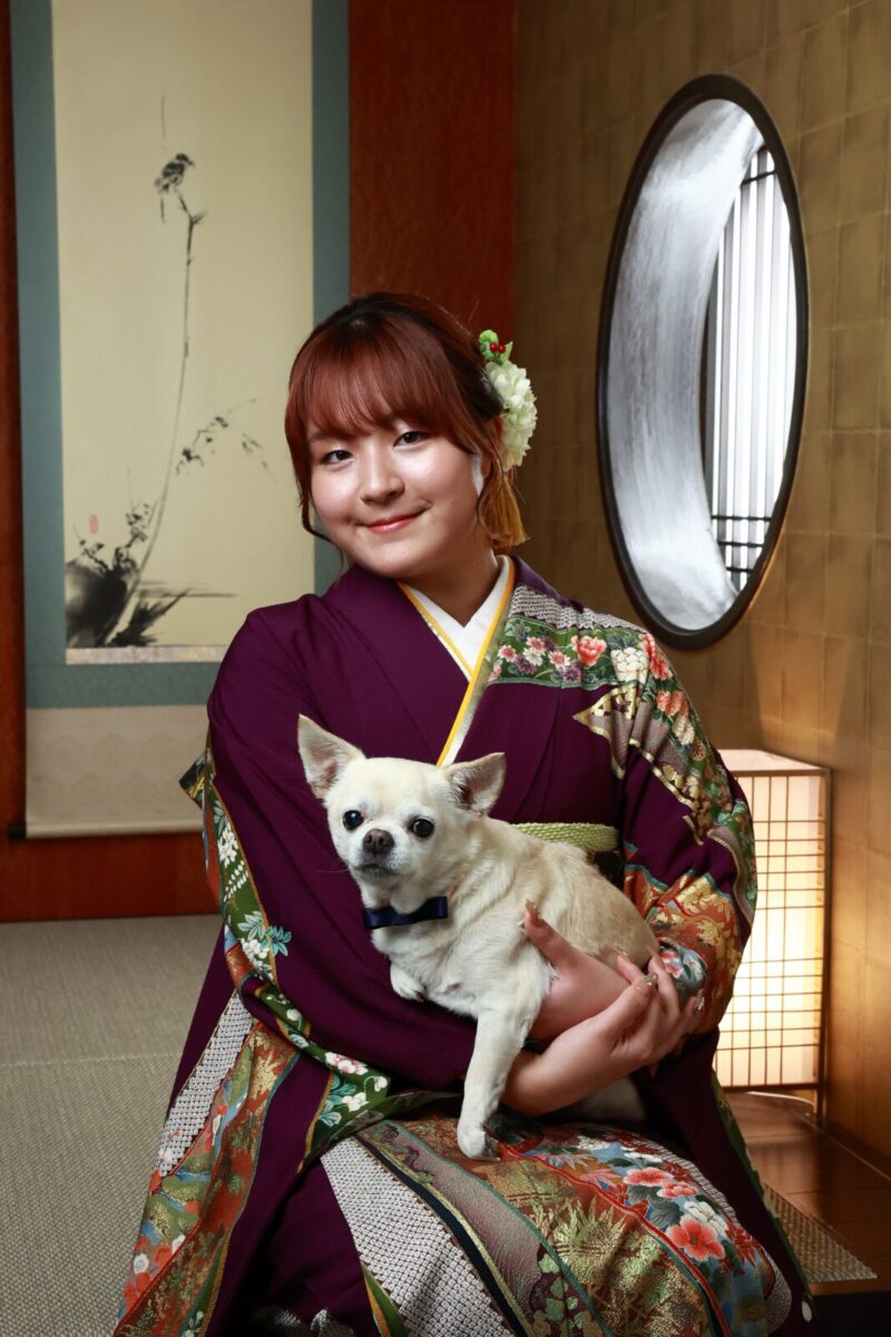 お振袖撮影といえばご家族写真が定番ですが、ペットちゃんも大切な家族の一員です。
