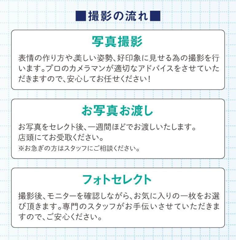 プロによる撮影と、ひとりひとりに合わせた丁寧なアドバイスで、 夢の実現への第一歩を応援します。